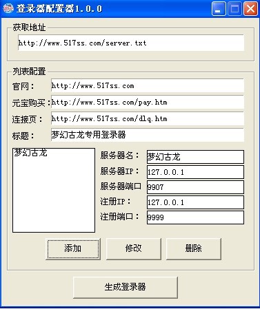 梦幻古龙专用登录器配置器 配置器 配置列表读取地址及列表内参数修改,包括区服列表修改
